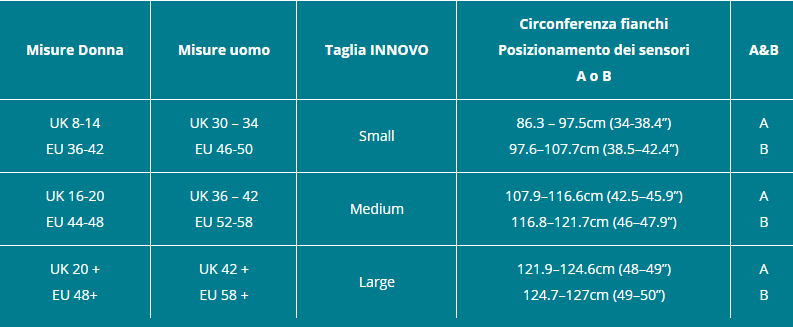 Measure the circumference of the pelvis and find your measurement on the chart to determine which INNOVO size you need for the placement of the electrodes on A or B.