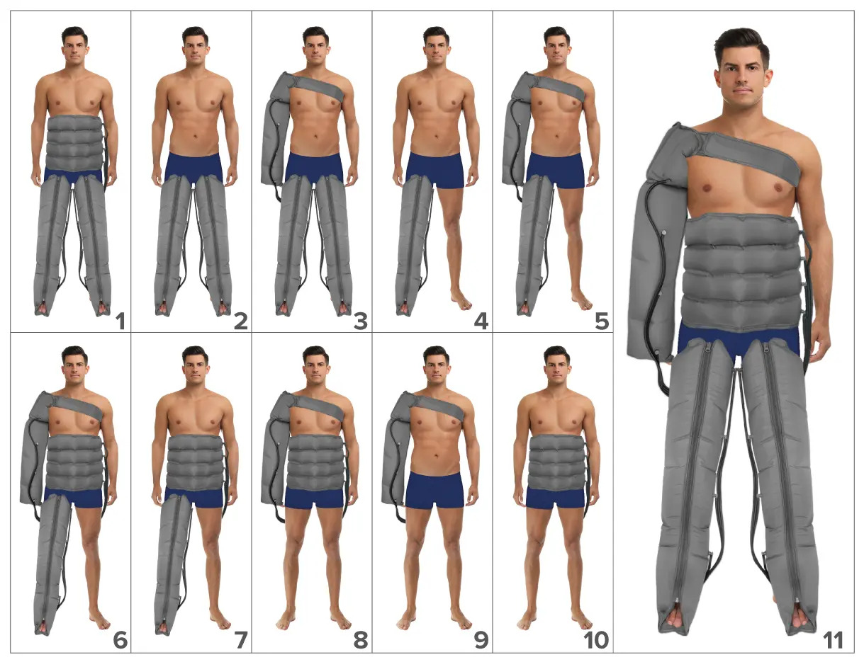 The chambers of the accessories are filled with air one at a time, keeping the previous ones inflated until they are fully inflated, to then deflate the whole leg (or cuff or band) and restart inflating one chamber at a time.