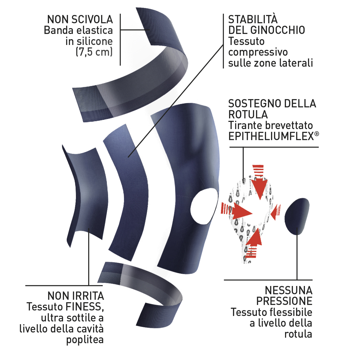 PhysioStrap supports the knee without compressing it thanks to the patented EPITHELIUMFLEX® technology.